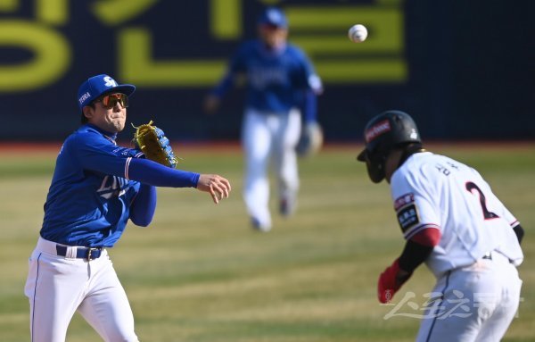 2일 경기도 수원KT위즈파크에서 열린 ‘2022 신한은행 SOL KBO리그’ KT 위즈와 삼성 라이온즈의 개막 경기에서 8회말 무사 1, 2루 KT의 내야 땅볼 때 삼성 2루수 김상수가 1루주자를 포스 아웃시킨 뒤 1루로 송구하고 있다.