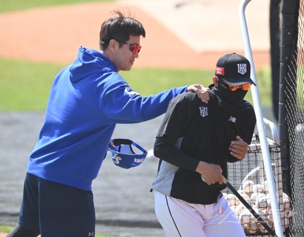 2일 경기도 수원KT위즈파크에서 열린 ‘2022 신한은행 SOL KBO리그’ KT 위즈와 삼성 라이온즈의 개막 경기에 앞서 삼성 강민호가 KT 박기혁 코치와 장난을 치고 있다.