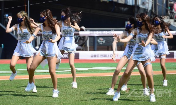 2일 경기도 수원KT위즈파크에서 열린 ‘2022 신한은행 SOL KBO리그’ KT 위즈와 삼성 라이온즈의 개막 경기에 앞서 KT 치어리더들이 그라운드에서 공연을 펼치고 있다.
