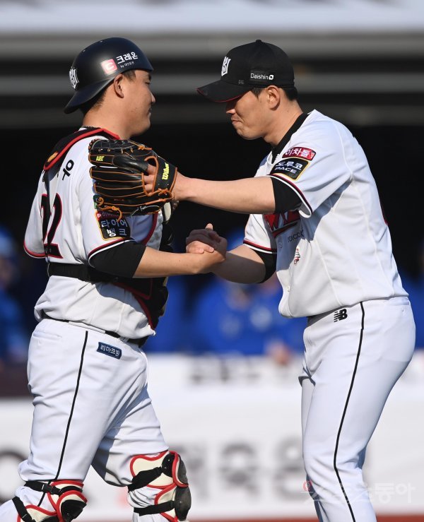 2일 경기도 수원KT위즈파크에서 열린 ‘2022 신한은행 SOL KBO리그’ KT 위즈와 삼성 라이온즈의 개막 경기에서 삼성에 4-1로 승리한 KT 장성우와 김재윤이 기쁨을 나누고 있다.