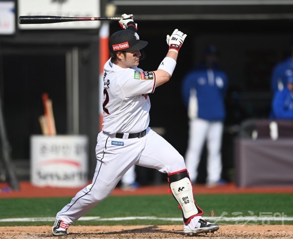 2일 경기도 수원KT위즈파크에서 열린 ‘2022 신한은행 SOL KBO리그’ KT 위즈와 삼성 라이온즈의 개막 경기에서 7회말 무사 1루 KT 박병호가 이적 후 첫 안타를 치고 있다.