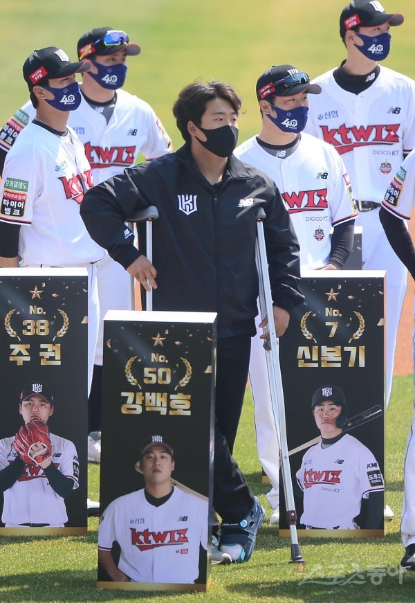 2일 경기도 수원KT위즈파크에서 열린 ‘2022 신한은행 SOL KBO리그’ KT 위즈와 삼성 라이온즈의 개막 경기에 앞서 우승반지 수여식에 KT 강백호가 목발을 짚고 나왔다.