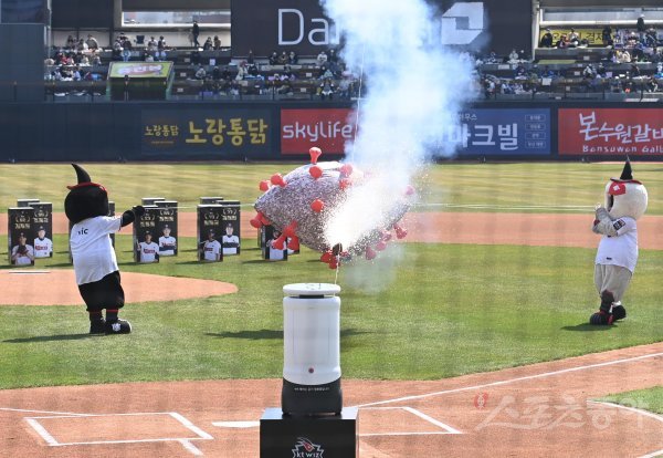 2일 경기도 수원KT위즈파크에서 열린 ‘2022 신한은행 SOL KBO리그’ KT 위즈와 삼성 라이온즈의 개막 경기에서 코로나19 바이러스 풍선을 터지며 라인 로켓을 이용한 개막 시구를 하고 있다.