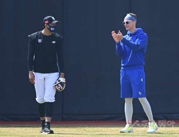 3일 경기도 수원KT위즈파크에서 열린 ‘2022 신한은행 SOL KBO리그’ KT 위즈와 삼성 라이온즈의 경기에 앞서 삼성 뷰캐넌과 KT 쿠에바스가 외야에서 이야기를 하고 있다.