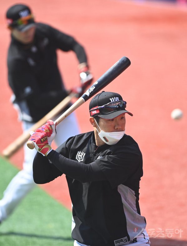 3일 경기도 수원KT위즈파크에서 열린 ‘2022 신한은행 SOL KBO리그’ KT 위즈와 삼성 라이온즈의 경기에 앞서 KT 신본기가 배팅 훈련을 하고 있다.