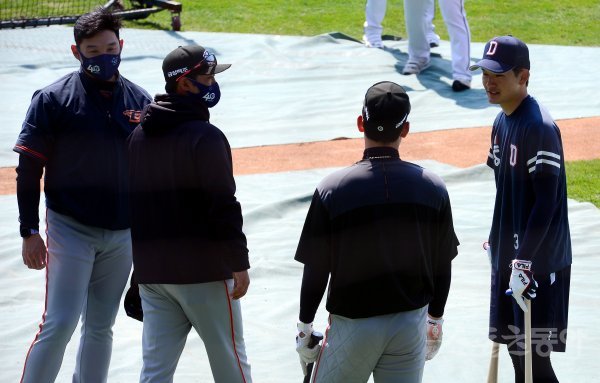 3일 서울 잠실야구장에서 ‘2022 신한은행 SOL KBO리그’ 두산 베어스와 한화 이글스의 경기가 열린다. 경기에 앞서 두산 안재석이 한화 선수들과 만나 이야기를 나누고 있다.