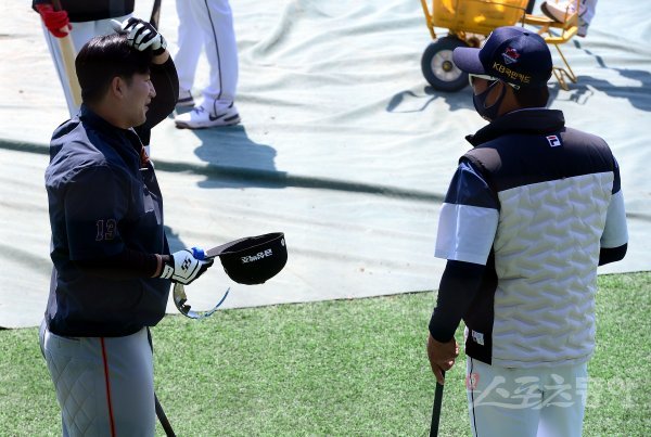 3일 서울 잠실야구장에서 ‘2022 신한은행 SOL KBO리그’ 두산 베어스와 한화 이글스의 경기가 열린다. 경기에 앞서 한화 최재훈이 두산 고영민 코치와 이야기를 나누고 있다.