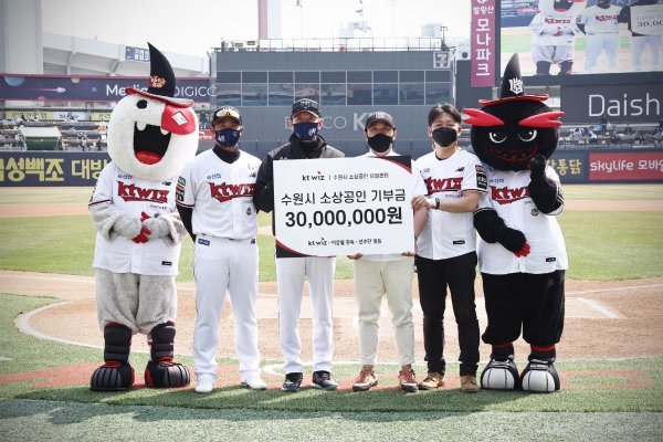 이날 시구를 맡은 수원도시재단 김승일 상권활성화 센터장은 “코로나19로 어려움에 처한 소상공인들을 위해 기부금을 마련해준 구단과 선수들에게 감사하다. 소상공인과 골목상권, 전통시장 활성화를 위해 구단과 적극 협력하겠다”고 고마움을 표시했다.
