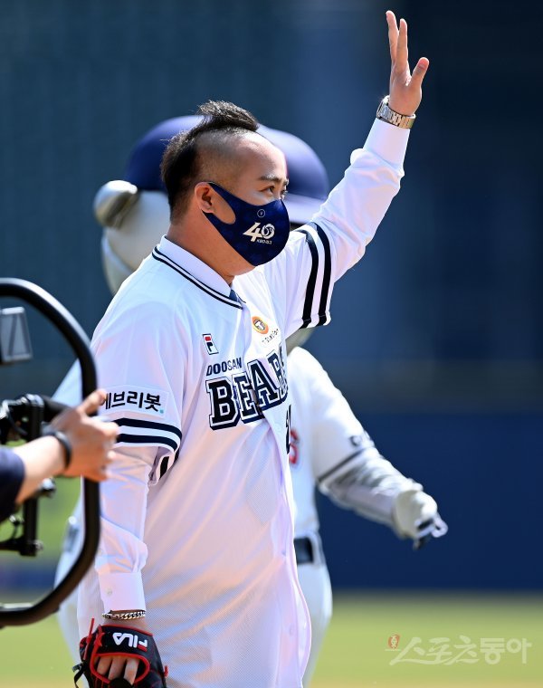 3일 서울 잠실야구장에서 ‘2022 신한은행 SOL KBO리그’ 두산 베어스와 한화 이글스의 경기가 열렸다. 경기 전 은퇴식을 앞둔 두산 유희관이 시구를 던진 후 팬들에게 인사를 하고 있다.