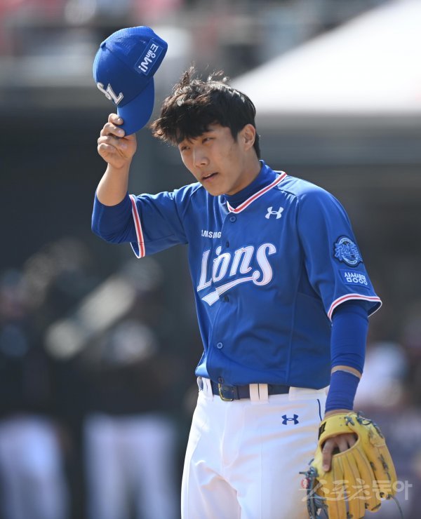 3일 경기도 수원KT위즈파크에서 열린 ‘2022 신한은행 SOL KBO리그’ KT 위즈와 삼성 라이온즈의 경기에서 5회말 2사 1, 3루 KT의 내야 뜬공을 놓친 삼성 이재현이 아쉬워하고 있다.