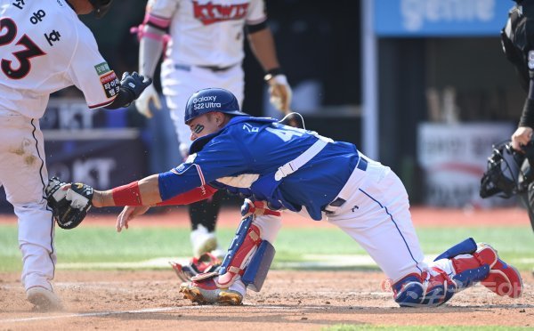 3일 경기도 수원KT위즈파크에서 열린 ‘2022 신한은행 SOL KBO리그’ KT 위즈와 삼성 라이온즈의 경기에서 5회말 2사 1, 3루 상황에서 삼성 김태군이 KT 3루주자를 태그 아웃시키고 있다.