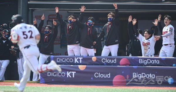 3일 경기도 수원KT위즈파크에서 열린 ‘2022 신한은행 SOL KBO리그’ KT 위즈와 삼성 라이온즈의 경기에서 3회말 2사 KT 박병호의 좌월 솔로 홈런에 더그아웃의 선수들이 기뻐하고 있다.