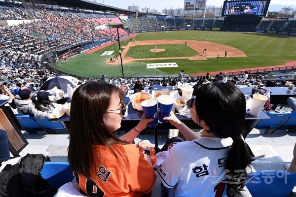 3일 서울 잠실야구장에서 ‘2022 신한은행 SOL KBO리그’ 두산 베어스와 한화 이글스의 경기가 열렸다. 한화와 두산 야구팬이 치맥(치킨+맥주)을 마시며 응원을 펼치고 있다.