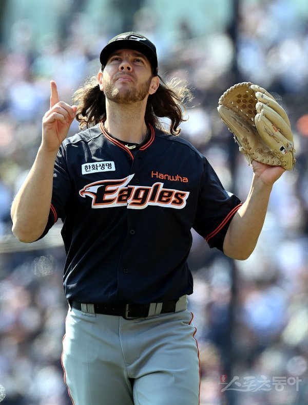 3일 서울 잠실야구장에서 ‘2022 신한은행 SOL KBO리그’ 두산 베어스와 한화 이글스의 경기가 열렸다. 한화 선발투수 킹험이 3회까지 두산 공격을 무실점으로 막은 뒤 더그아웃으로 향하며 환화고 있다.