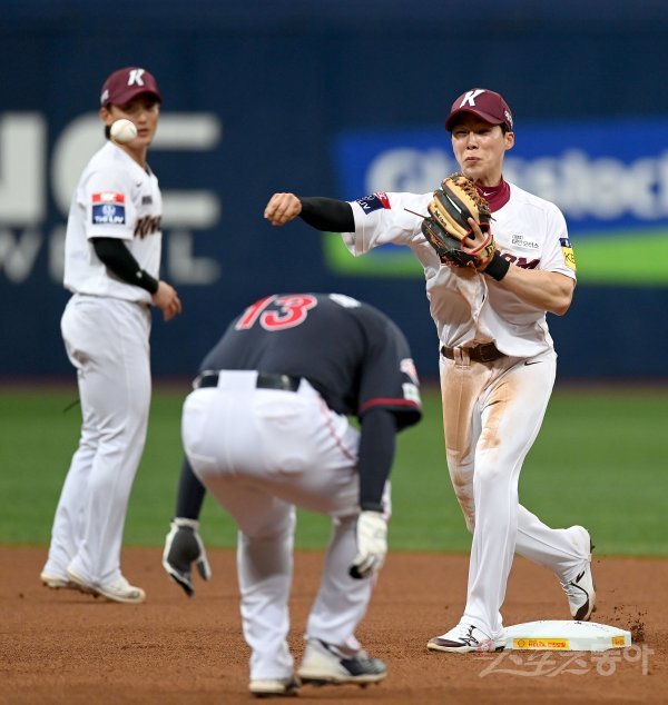 3일 서울 고척스카이돔에서 ‘2022 신한은행 MY CAR KBO리그’ 롯데 자이언츠와 키움 히어로즈의 경기가 열렸다. 6회초 무사 1루 롯데 내야 땅볼 때 키움 김혜성이 1루주자를 포스 아웃시킨 후 1루로 송구하고 있다.