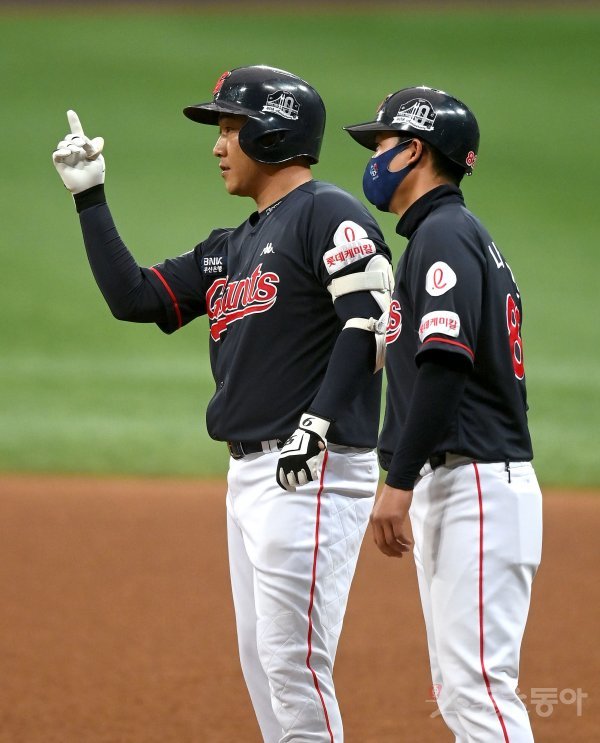 3일 서울 고척스카이돔에서 ‘2022 신한은행 MY CAR KBO리그’ 롯데 자이언츠와 키움 히어로즈의 경기가 열렸다. 5회초 무사 롯데 정훈이 좌전 안타를 치고 1루에서 기뻐하고 있다.