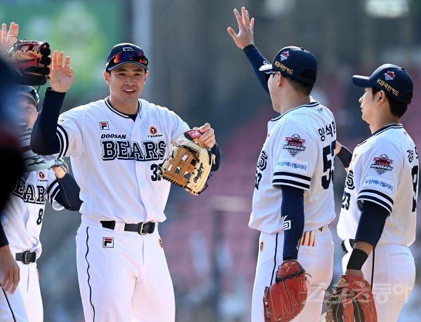 3일 서울 잠실야구장에서 ‘2022 신한은행 SOL KBO리그’ 두산 베어스와 한화 이글스의 경기가 열렸다. 두산이 한화를 상대로 1-0으로 승리한 뒤 결승 홈런을 날린 김재환이 동료들과 기쁨을 나누고 있다.