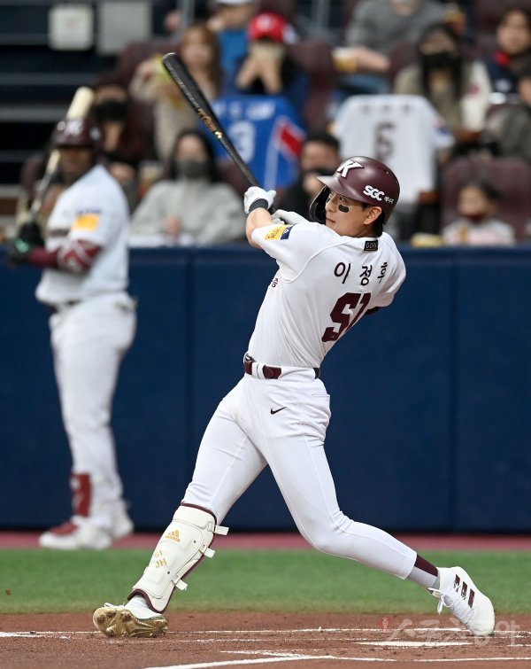 3일 서울 고척스카이돔에서 ‘2022 신한은행 MY CAR KBO리그’ 롯데 자이언츠와 키움 히어로즈의 경기가 열렸다. 1회말 2사 키움 이정후가 중전 2루타를 치고 있다.