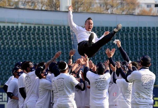 3일 서울 잠실야구장에서 ‘2022 신한은행 SOL KBO리그’ 두산 베어스와 한화 이글스의 경기가 열렸다. 경기 종료 후 두산 유희관이 은퇴식에 참석해 동료들로부터 헹가래를 받고 있다.