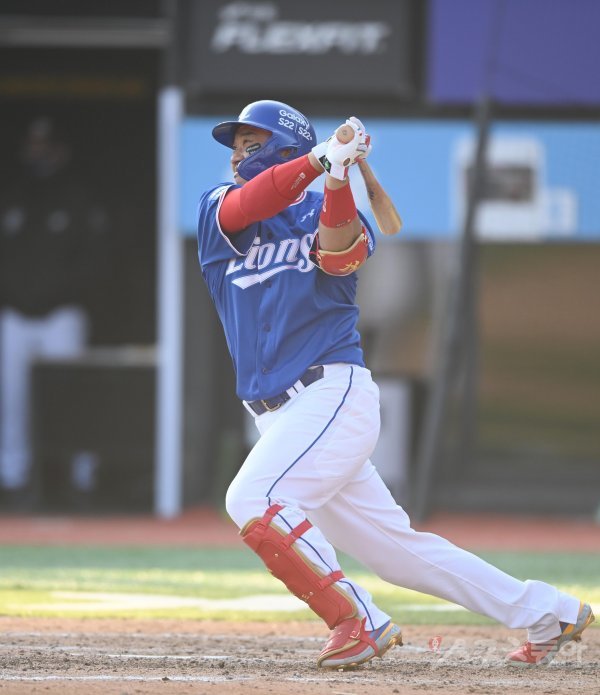 3일 경기도 수원KT위즈파크에서 열린 ‘2022 신한은행 SOL KBO리그’ KT 위즈와 삼성 라이온즈의 경기에서 9회초 1사 만루 삼성 김태군이 역전 3타점 2루타를 치고 있다.