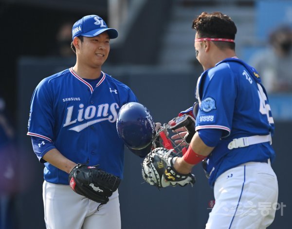 3일 경기도 수원KT위즈파크에서 열린 ‘2022 신한은행 SOL KBO리그’ KT 위즈와 삼성 라이온즈의 경기에서 7회말 무사 만루 위기를 넘긴 삼성 이재익이 포수 장비를 챙기며 웃고 있다.