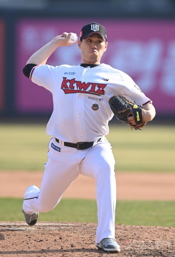 3일 경기도 수원KT위즈파크에서 열린 ‘2022 신한은행 SOL KBO리그’ KT 위즈와 삼성 라이온즈의 경기에서 9회초 KT 김재윤이 교체로 마운드에 올라 역투하고 있다.