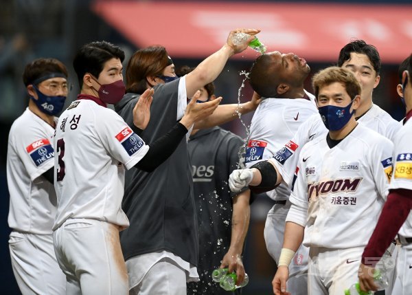 3일 서울 고척스카이돔에서 ‘2022 신한은행 MY CAR KBO리그’ 롯데 자이언츠와 키움 히어로즈의 경기가 열렸다. 연장 10회말 1사 2루 키움 전병우가 끝내기 안타때 득점한 푸이그가 물세례를 받고 있다.