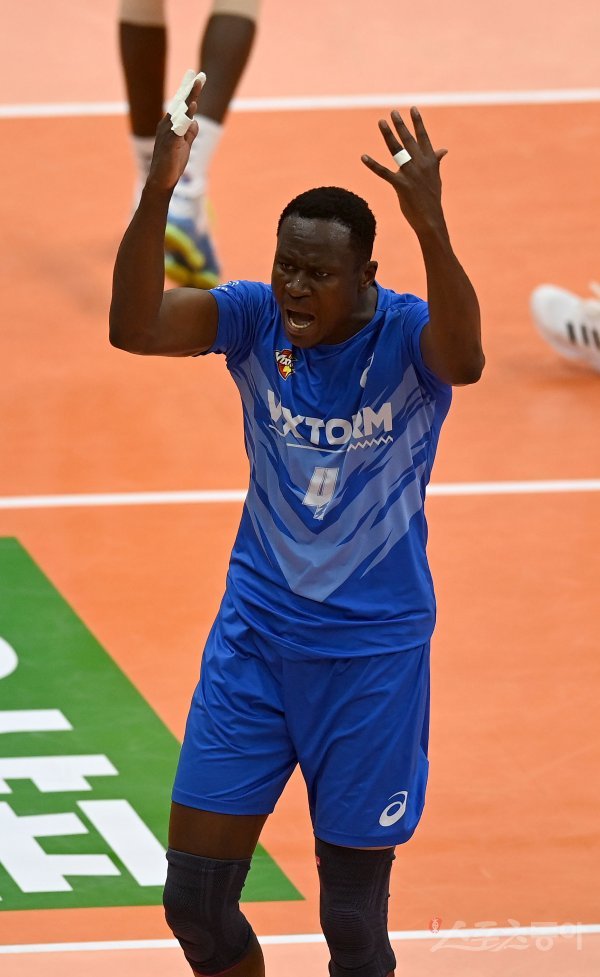 3일 의정부체육관에서 열린 ‘2021~2022 도드람 V-리그’ 남자부 플레이오프 KB손해보험과 한국전력 경기에서 한국전력 다우디가 공격 득점에 성공한 후 기뻐하고 있다.