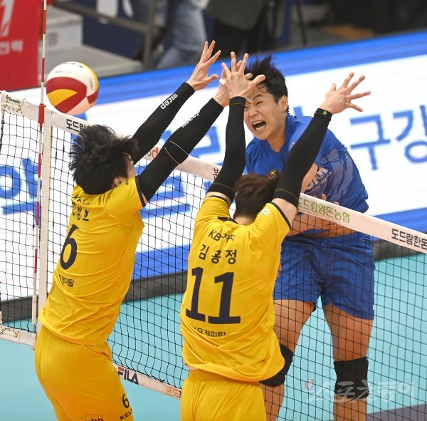 3일 의정부체육관에서 열린 ‘2021~2022 도드람 V-리그’ 남자부 플레이오프 KB손해보험과 한국전력 경기에서 한국전력 서재덕이 KB손해보험의 블로킹 사이로 스파이크를 날리고 있다.