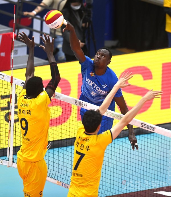 3일 의정부체육관에서 열린 ‘2021~2022 도드람 V-리그’ 남자부 플레이오프 KB손해보험과 한국전력 경기에서 한국전력 다우디가 KB손해보험의 블로킹 사이로 밀어넣기 공격을 있다.