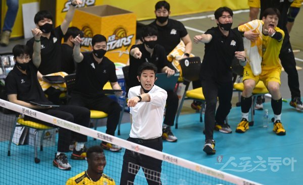 3일 의정부체육관에서 열린 ‘2021~2022 도드람 V-리그’ 남자부 플레이오프 KB손해보험과 한국전력 경기에서 KB손해보험 후인정 감독이 판정에 대해 어필하고 있다.