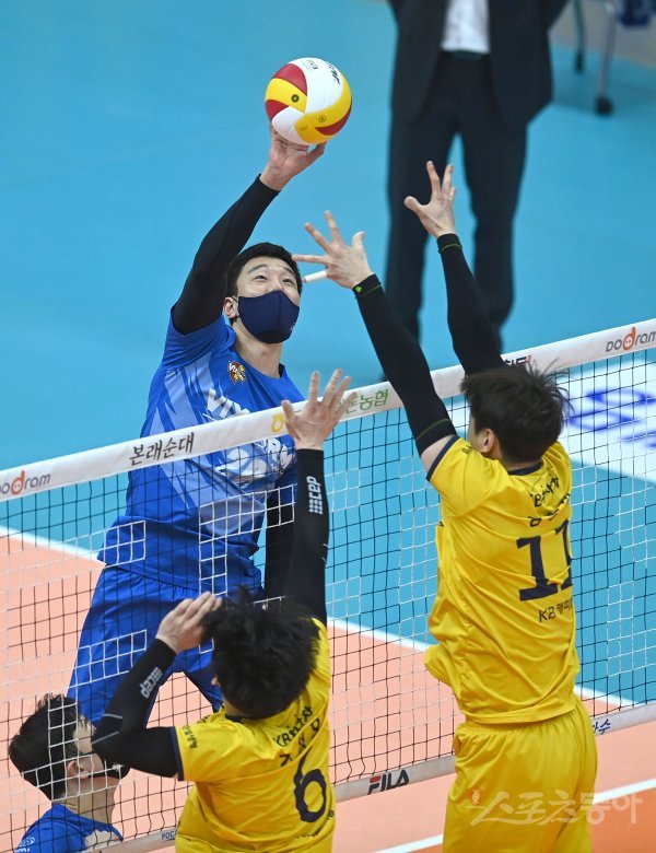 3일 의정부체육관에서 열린 ‘2021~2022 도드람 V-리그’ 남자부 플레이오프 KB손해보험과 한국전력 경기에서한국전력 신영석이 KB손해보험의 블로킹 사이로 밀어넣기 공격을 있다.