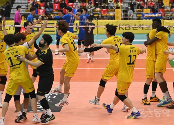 3일 의정부체육관에서 열린 ‘2021~2022 도드람 V-리그’ 남자부 플레이오프 KB손해보험과 한국전력 경기에서 세트스코어 3-1 승리를 거두며 챔피언결정전에 진출한 KB손해보험 선수들이 기뻐하고 있다.