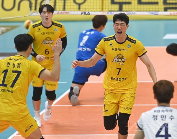 3일 의정부체육관에서 열린 ‘2021~2022 도드람 V-리그’ 남자부 플레이오프 KB손해보험과 한국전력 경기에서 KB손해보험 박진우가 블로킹 득점에 성공한 후 기뻐하고 있다.