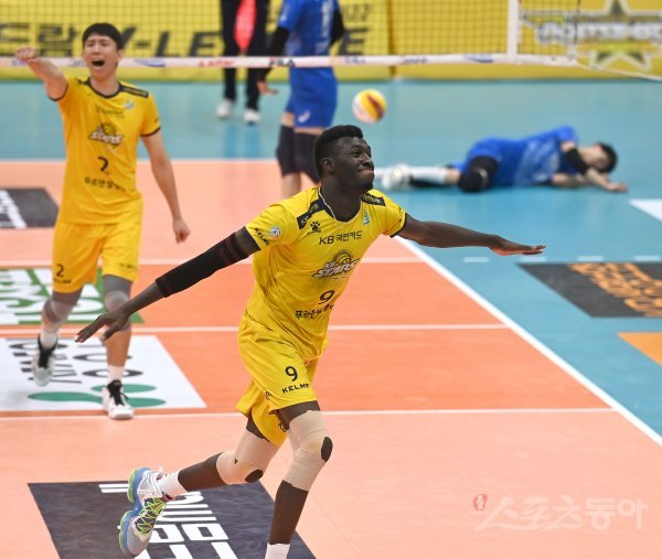 3일 의정부체육관에서 열린 ‘2021~2022 도드람 V-리그’ 남자부 플레이오프 KB손해보험과 한국전력 경기에서 KB손해보험 케이타가 블로킹 득점에 성공한 후 기뻐하고 있다.