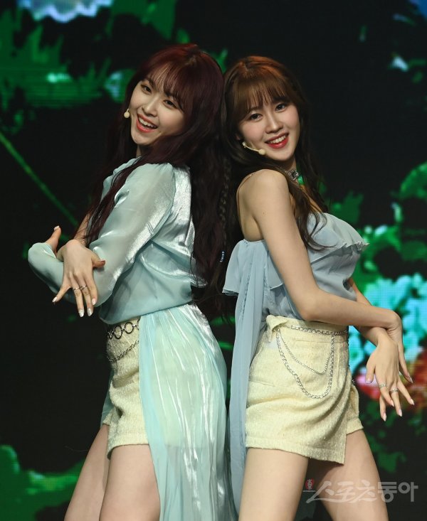 그룹 아일리원(ILY:1) 리리카와 아라가 4일 서울 강남구 청담동 일지아트홀에서 열린 데뷔 앨범 ‘사랑아 피어라(Love in Bloom)‘ 발매 기념 프레스 쇼케이스에서 타이틀곡 ’사랑아 피어라‘ 무대를 펼치고 있다.