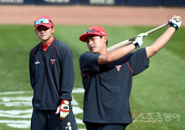 5일 광주기아챔피언스필드에서 ‘2022 신한은행 SOL KBO리그’ KIA 타이거즈와 한화 이글스의 경기가 열린다. 경기에 앞서 KIA 김도영이 선배의 타격을 지켜보고 있다.
