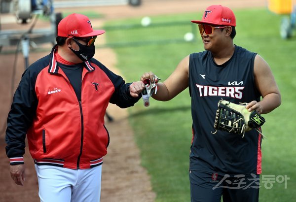 5일 광주기아챔피언스필드에서 ‘2022 신한은행 SOL KBO리그’ KIA 타이거즈와 한화 이글스의 경기가 열린다. 경기에 앞서 KIA 황대인이 진갑용 코치와 이야기를 나누고 있다.
