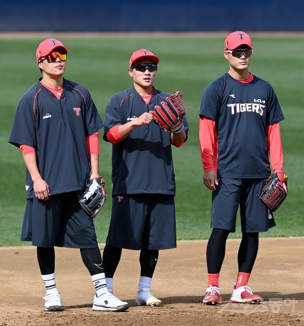5일 광주기아챔피언스필드에서 ‘2022 신한은행 SOL KBO리그’ KIA 타이거즈와 한화 이글스의 경기가 열린다. 경기에 앞서 KIA 류지혁, 김태진, 박민이 훈련을 준비하고 있다.
