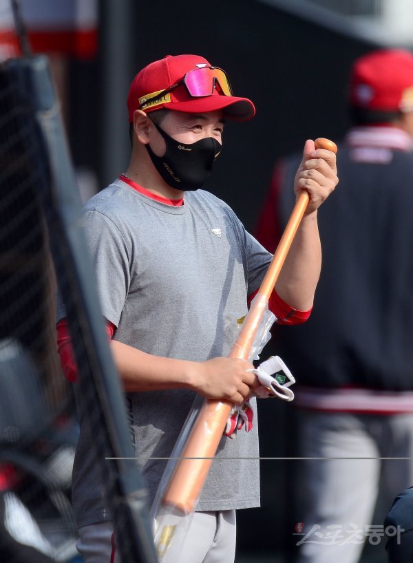 5일 수원KT위즈파크에서 ‘2022 신한은행 MY CAR KBO리그’ SSG 랜더스와 KT 위즈의 경기가 열린다. SSG 최주환이 새 배트를 꺼내고 있다.