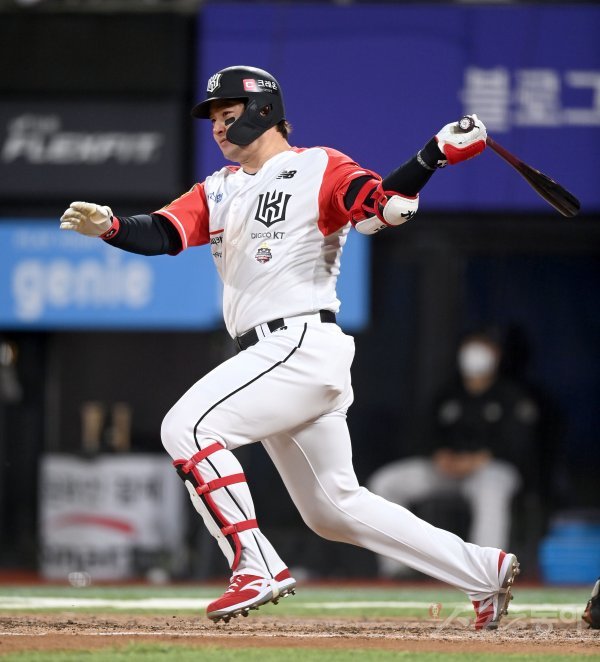 5일 수원KT위즈파크에서 ‘2022 신한은행 MY CAR KBO리그’ SSG 랜더스와 KT 위즈의 경기가 열렸다. 5회말 1사 1,3루 KT 박병호가 다시 앞서가는 1타점 적시타를 치고 있다.