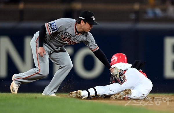 5일 광주기아챔피언스필드에서 ‘2022 신한은행 SOL KBO리그’ KIA 타이거즈와 한화 이글스의 경기가 열렸다. 2회말 1사 1루에서 KIA 박찬호가 2루타를 날린 후 한화 정은원의 태그를 피해 2루까지 진루하고 있다.