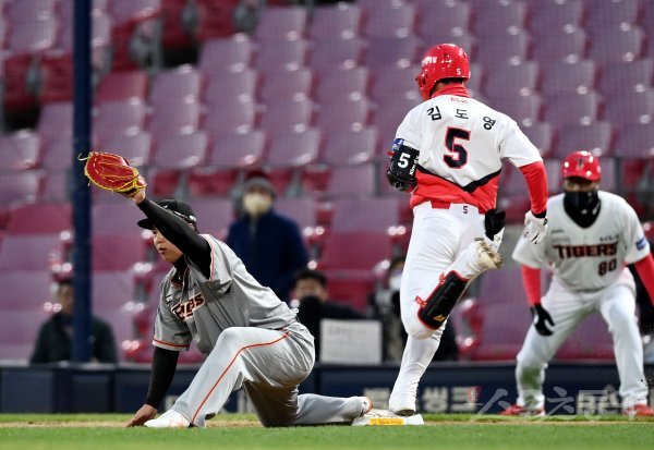 5일 광주기아챔피언스필드에서 ‘2022 신한은행 SOL KBO리그’ KIA 타이거즈와 한화 이글스의 경기가 열렸다. 2회말 무사에서 KIA 김도영이 선두타자로 나서 내야땅볼을 치고난 후 1루에서 아웃되고 있다.
