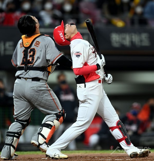 5일 광주기아챔피언스필드에서 ‘2022 신한은행 SOL KBO리그’ KIA 타이거즈와 한화 이글스의 경기가 열렸다. 4회말 1사에서 KIA 김도영이 포수 파울플라이 타구를 날리고 있다.