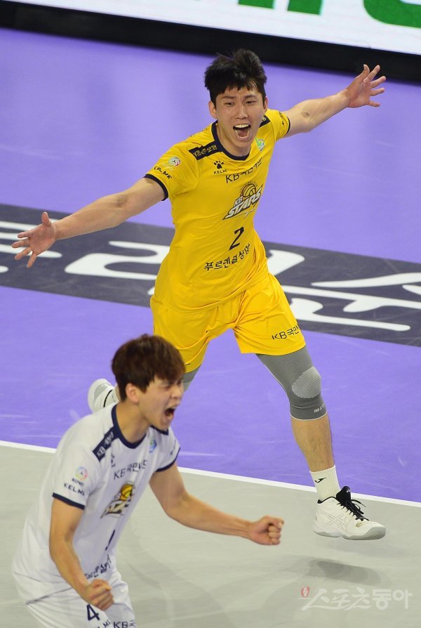 5일 인천계양체육관에서 열린 ‘2021~2022 도드람 V-리그’ 남자부 챔피언결정전 1차전 인천 대한항공과 의정부 KB손해보험의 경기에서 KB손해보험 황택의가 팀 득점에 기뻐하고 있다.