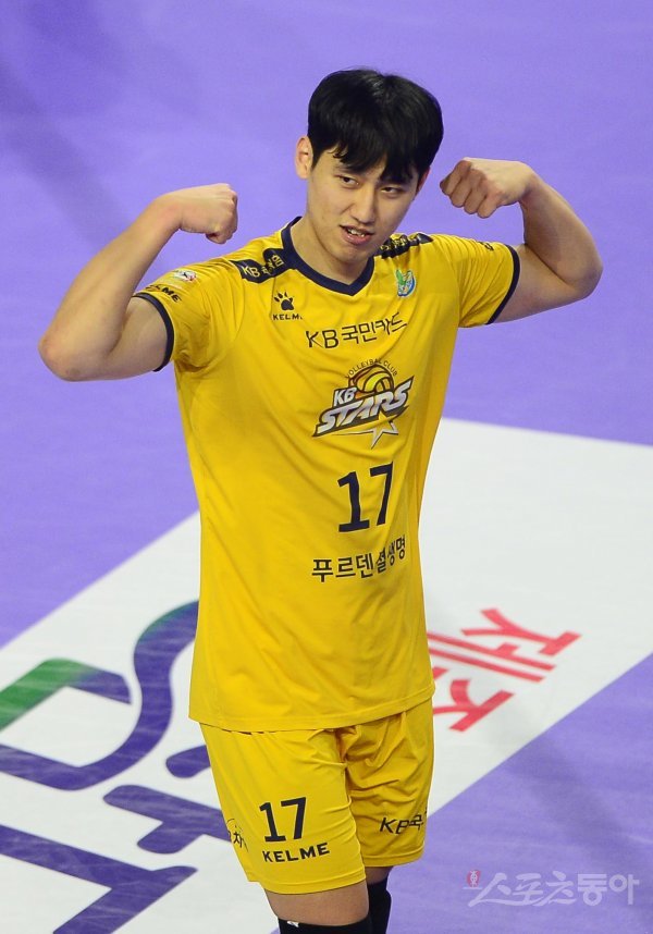 5일 인천계양체육관에서 열린 ‘2021~2022 도드람 V-리그’ 남자부 챔피언결정전 1차전 인천 대한항공과 의정부 KB손해보험의 경기에서 KB손해보험 한성정이 서브 득점에 성공한 후 세리머니를 하고 있다.