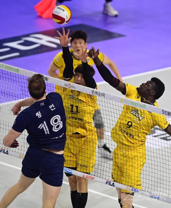 5일 인천계양체육관에서 열린 ‘2021~2022 도드람 V-리그’ 남자부 챔피언결정전 1차전 인천 대한항공과 의정부 KB손해보험의 경기에서 KB손해보험 김홍정과 케이타가 대한항공의 스파이크를 막기 위해 블로킹 하고 있다.