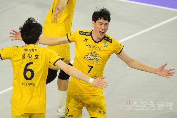 5일 인천계양체육관에서 열린 ‘2021~2022 도드람 V-리그’ 남자부 챔피언결정전 1차전 인천 대한항공과 의정부 KB손해보험의 경기에서 KB손해보험 박진우가 블로킹 득점에 성공한 후 기뻐하고 있다.