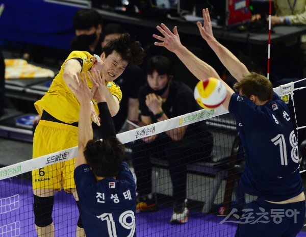 5일 인천계양체육관에서 열린 ‘2021~2022 도드람 V-리그’ 남자부 챔피언결정전 1차전 인천 대한항공과 의정부 KB손해보험의 경기에서 KB손해보험 김정호가 대한항공 블로커 사이로 스파이크를 하고 있다.