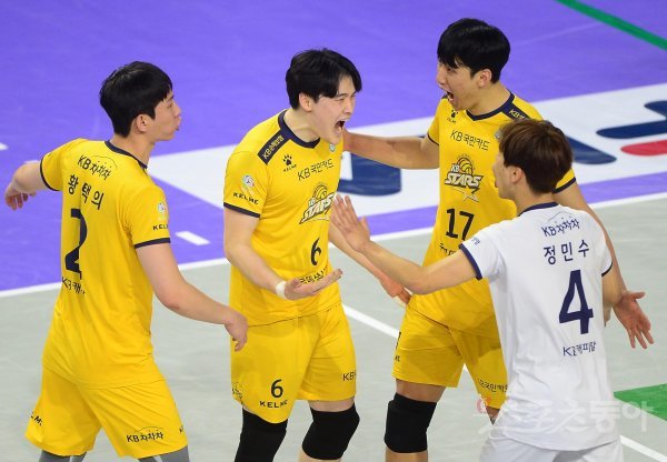 5일 인천계양체육관에서 열린 ‘2021~2022 도드람 V-리그’ 남자부 챔피언결정전 1차전 인천 대한항공과 의정부 KB손해보험의 경기에서 KB손해보험 김정호가 서브 득점에 성공한 후 포효하고 있다.
